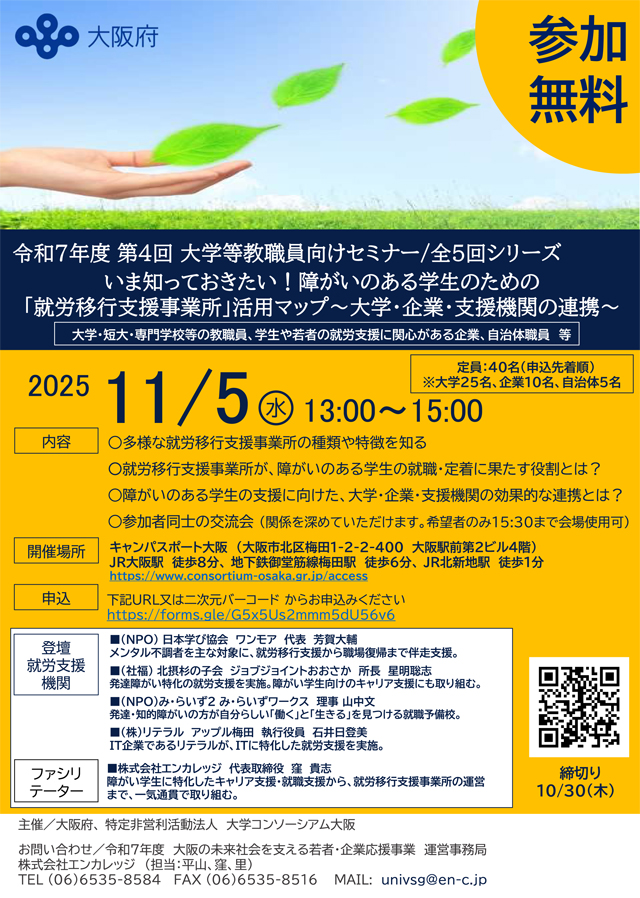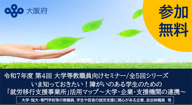 大阪府では、就職困難性を抱える学生や障がいのある学生の就職支援や企業との連携強化を目的としたセミナーを開催いたします。